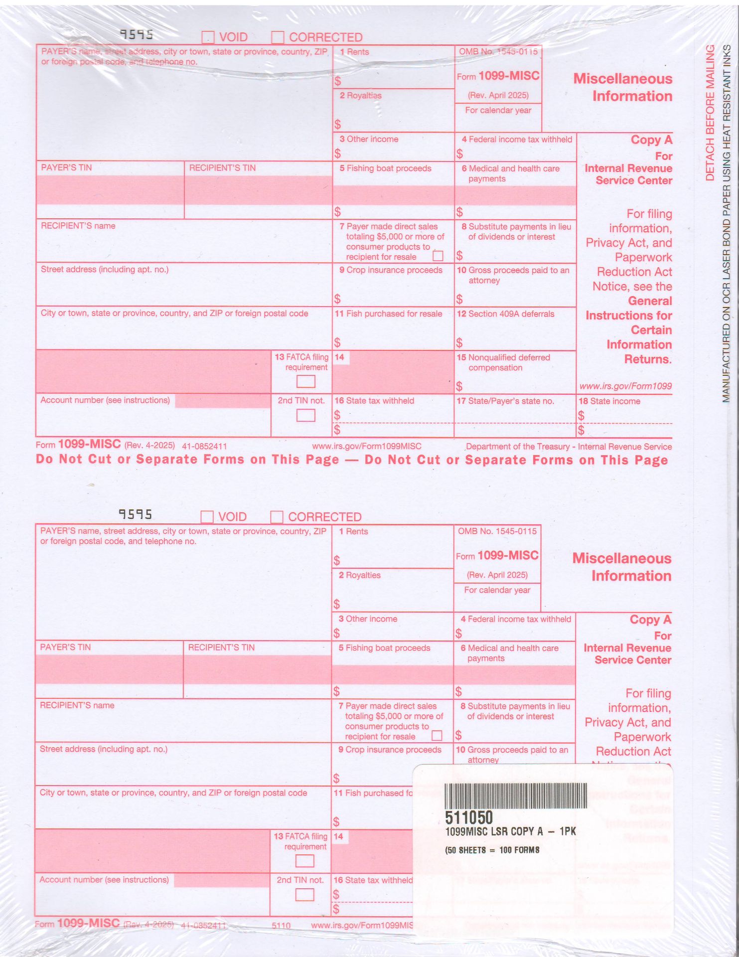 1 Unit = 100 Forms (50 Sheets 2-Up)